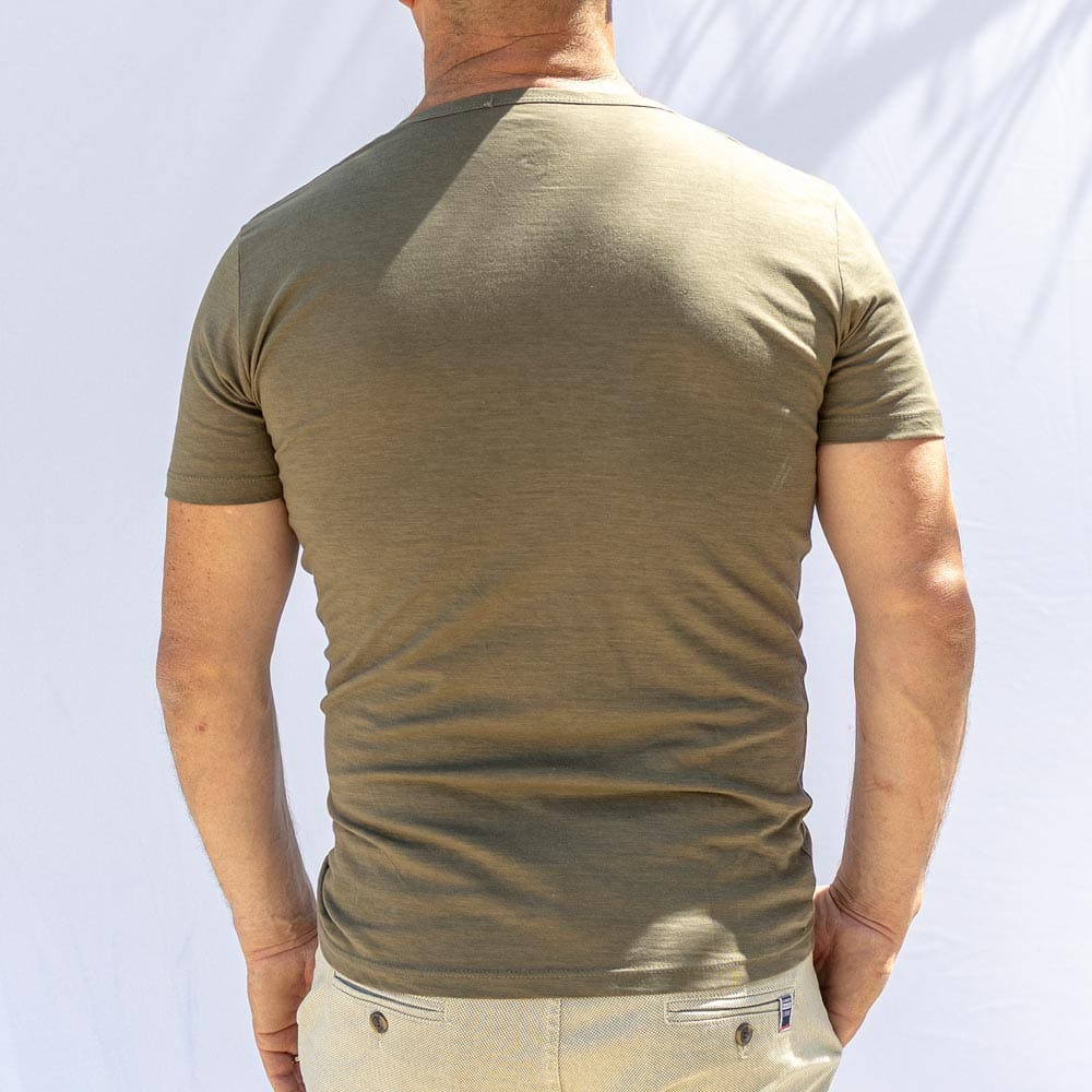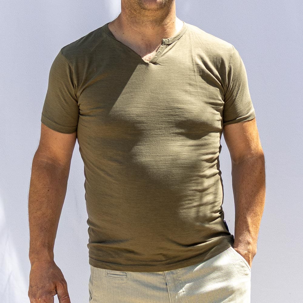 Le col tunisien, caractéristique clé de la gamme Manu, apporte une petite touche de style supplémentaire comparé à un col rond classique. Sans bouton ni patte de boutonnage, il conserve une ligne épurée tout en habillant subtilement le buste. Les coutures de renfort sur les épaules et aux emmanchures renforcent la durabilité de la pièce, tandis que la bande d’encolure à l’intérieur garantit une tenue stable et l’absence de déformation.